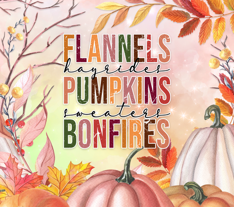 Multicolored Autumn Leaves/Pumpkins - "Flannels, Pumpkins, Bonfire" - Pink w/ Yellow Background - 20 Oz Sublimation Transfer
