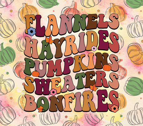 Multicolored Autumn Theme- "Flannels, Hayrides, Pumpkins, Sweaters, Bonfires" - Yellow & Pink Background - 20 Oz Sublimation Transfer