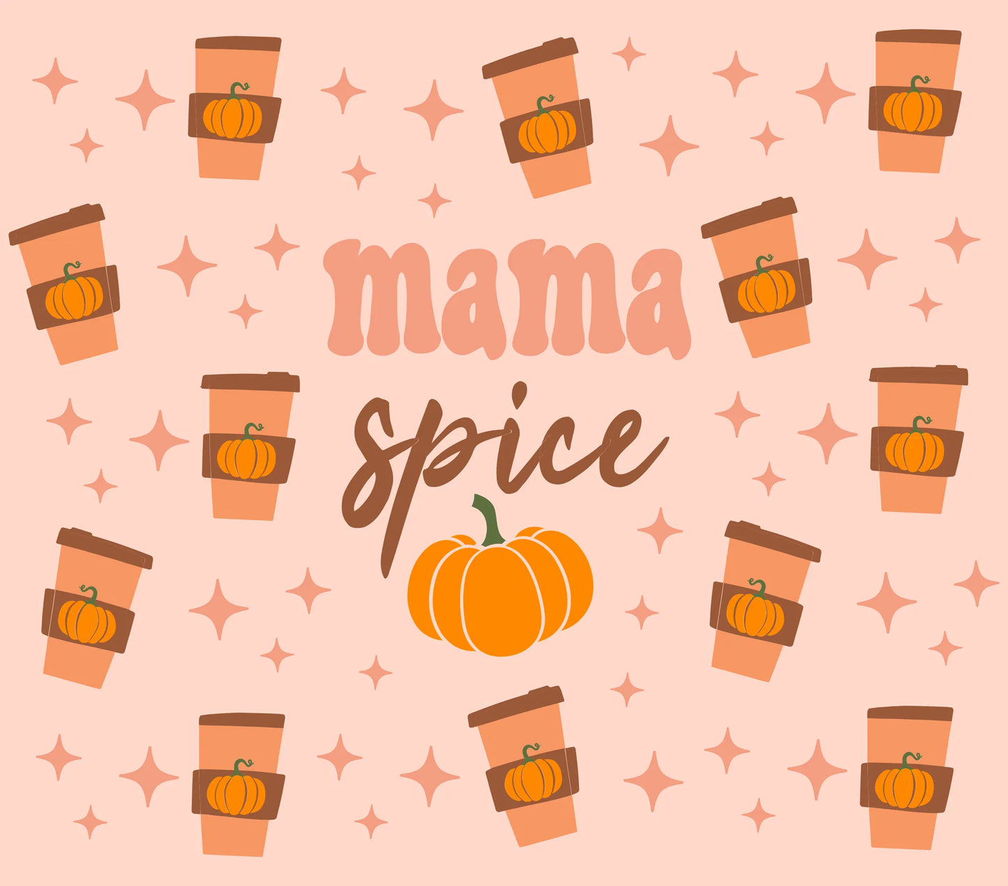 Autumn Coffee Theme - "Mama Spice" - Orange & Brown Coffee Cups w/ Coral Pink Background - 20 Oz Sublimation Transfer