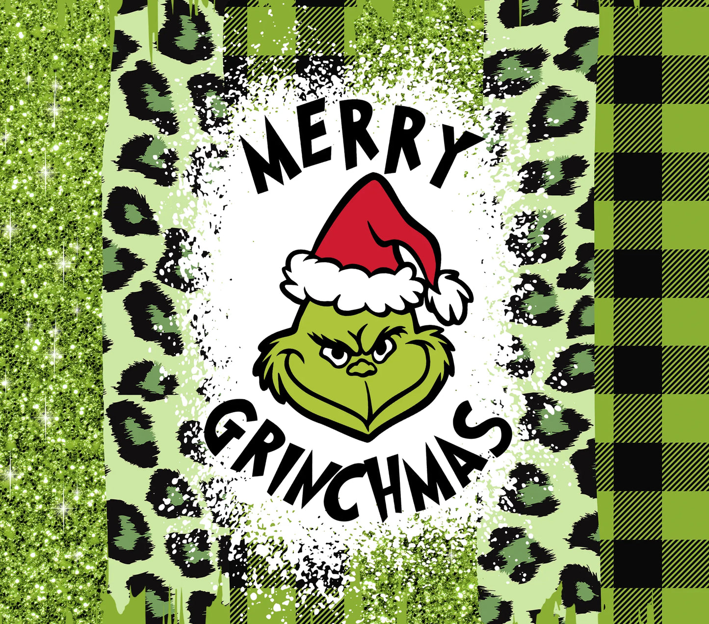 Evil Christmas Green Man - Cartoon - "Merry Grinchmas" - Green Sparkle/Plaid/Cheetah Pattern w/ White - 20 Oz Sublimation Transfer