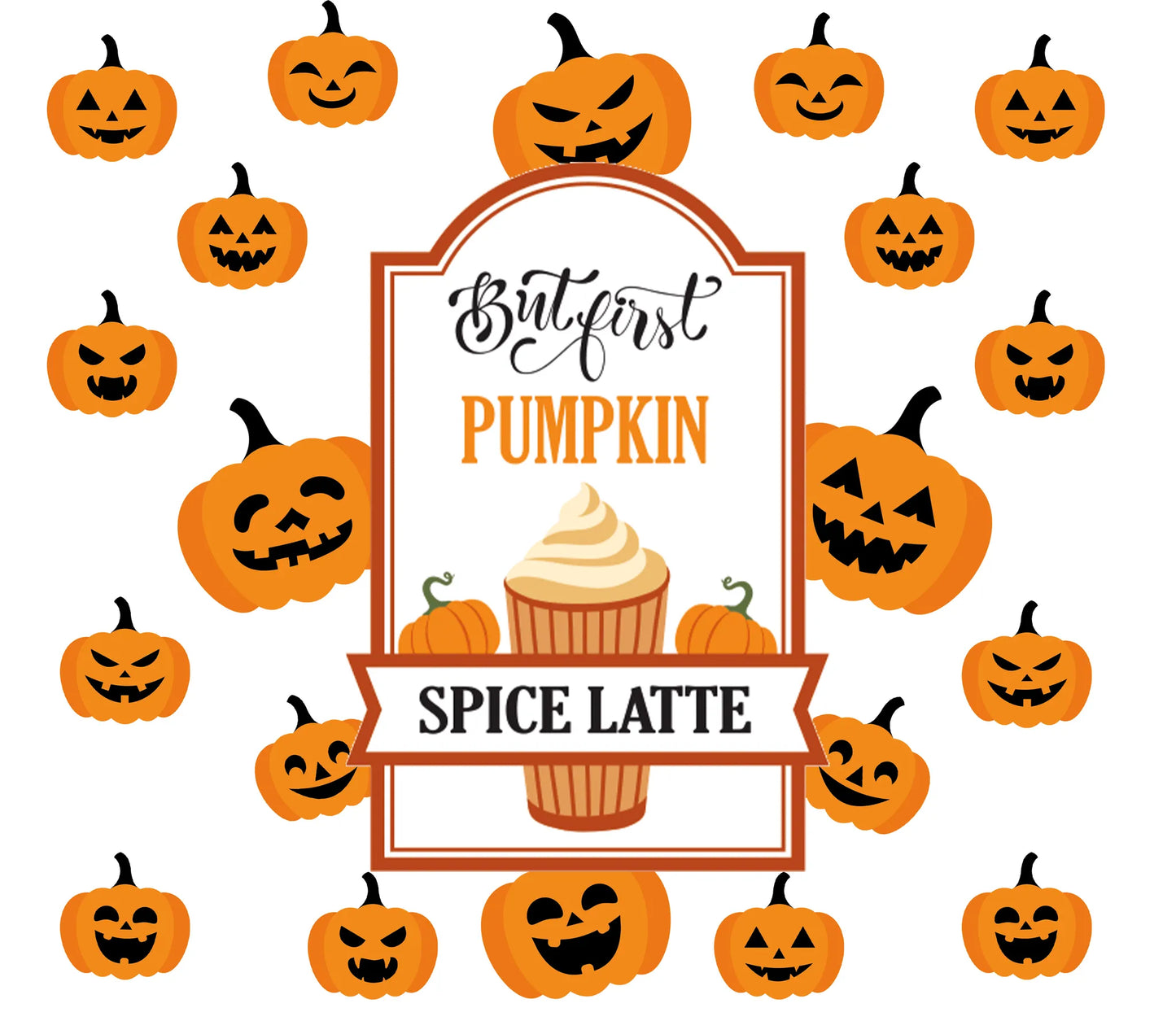 Halloween Coffee Theme - "But First, Pumpkin Spice Latte" - Multi Emotional Orange Pumpkins w/ White Background - 20 Oz Sublimation Transfer