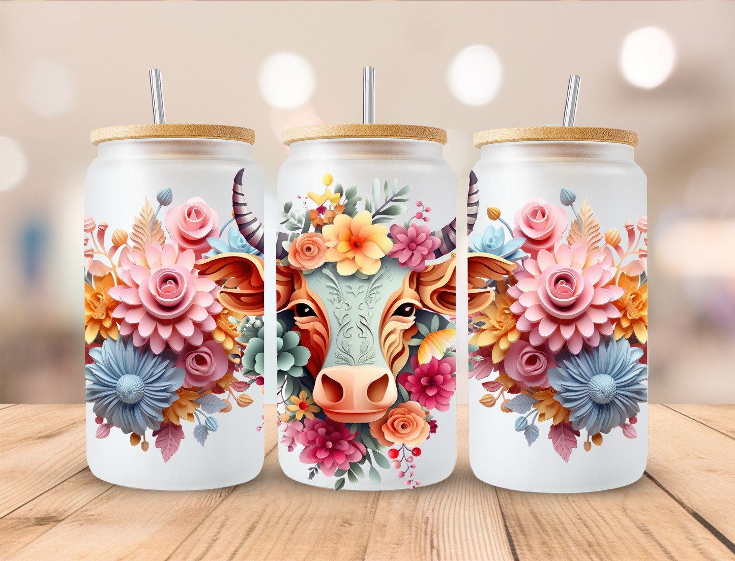 3D Floral Cow - 16 oz / 20 oz Libby UV DTF Wrap