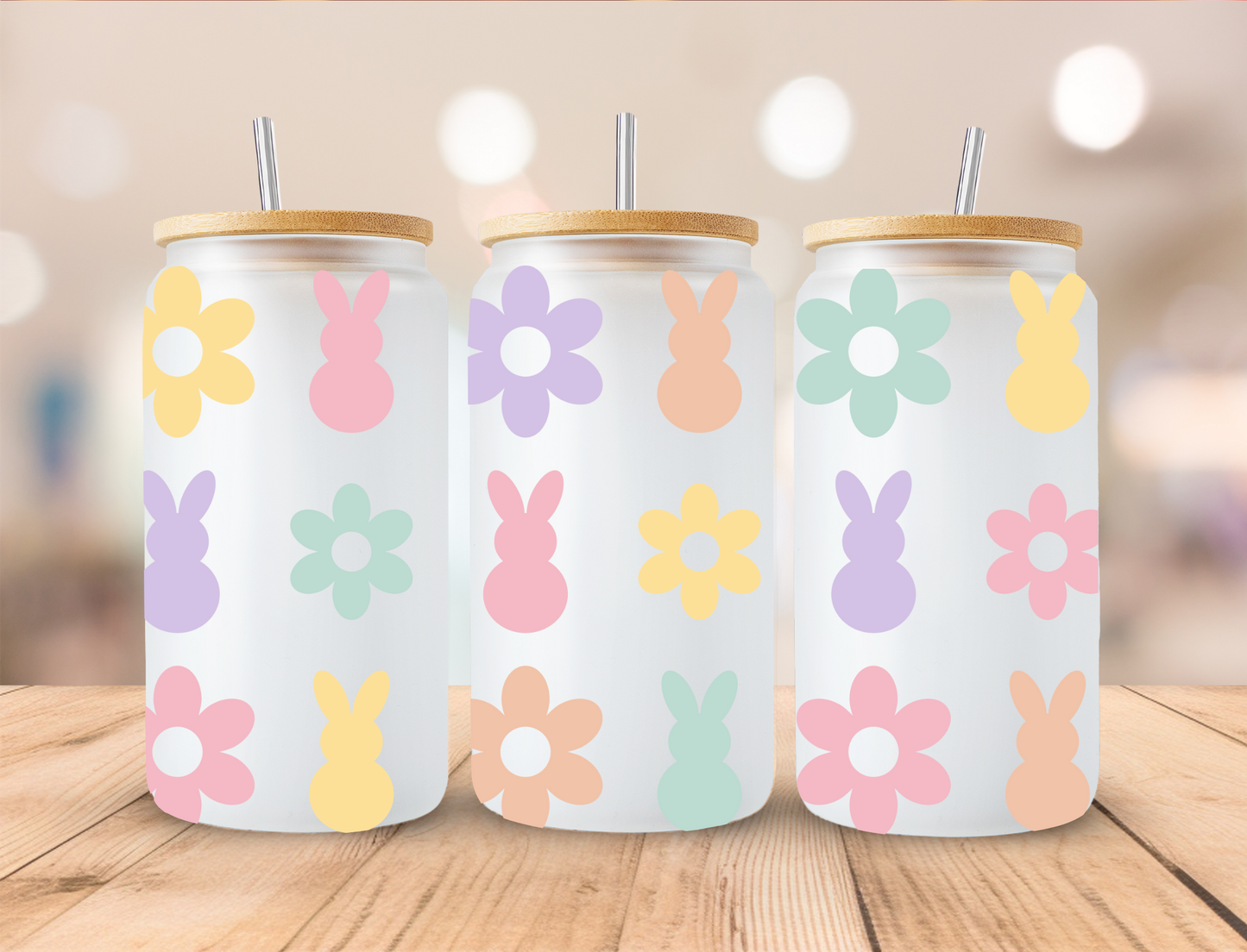 Easter Retro Pastel Floral Bunnies - 16 oz / 20 oz Libby UV DTF Wrap